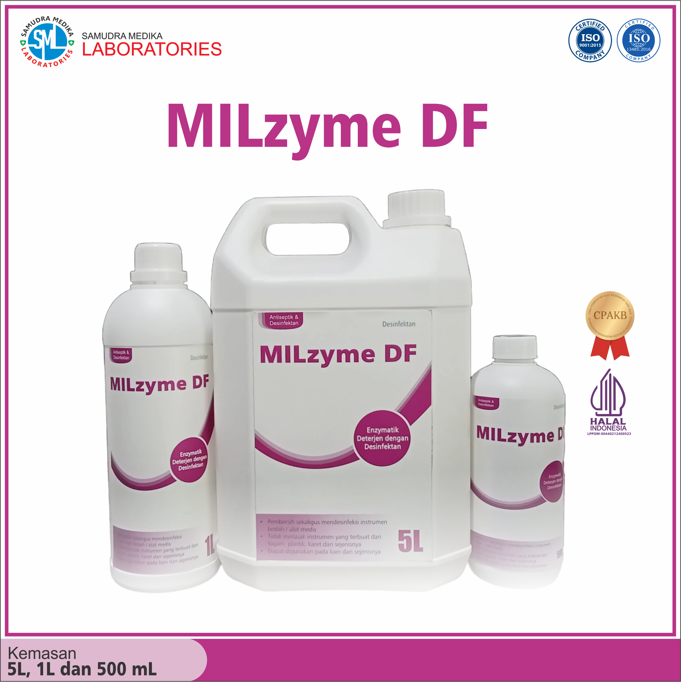 Milzyme DF adalah desinfektan untuk instrumen bedah/alat medis serta kain/linen di Rumah Sakit, dimana Milzyme DF terbuat dari bahan aktif Polyhexamethylene Biguanide. yang efektif sebagai desinfektant mekanismen kerjanya yaitu menetralkan sistem perlindungan dinding sel bakteri kemudian melewati dinding sel untuk bergabung dengan membran sitoplasma. Polyhexamethylene Biguanide masuk dalam tahap 1 aksinya melawan bakteri. Kemudian Polyhexamethylene Biguanide menciptakan beberapa ruang di membran sitoplasma oleh asosiasi dengan protein membuat membran sel bakteri semakin permeabel, kemudian Polyhexamethylene Biguanide masuk pada tahap 2 aksi dari aksinya melawan bakteri yaitu dengan memecah membran sitoplasma sel menyebabkan kematian sel pada bakteri. Berwarna biru. Milzyme DF dikemas dalam kemasan galon 5 liter, botol 1 liter, dan botol 500 ml.